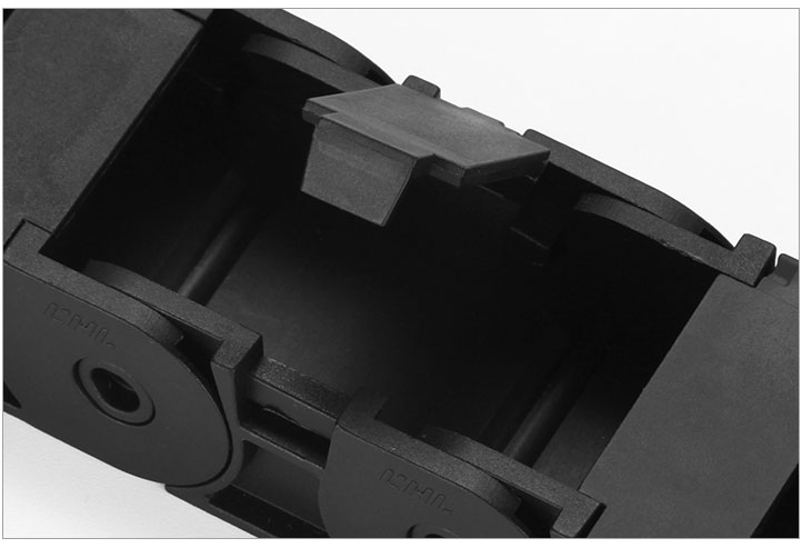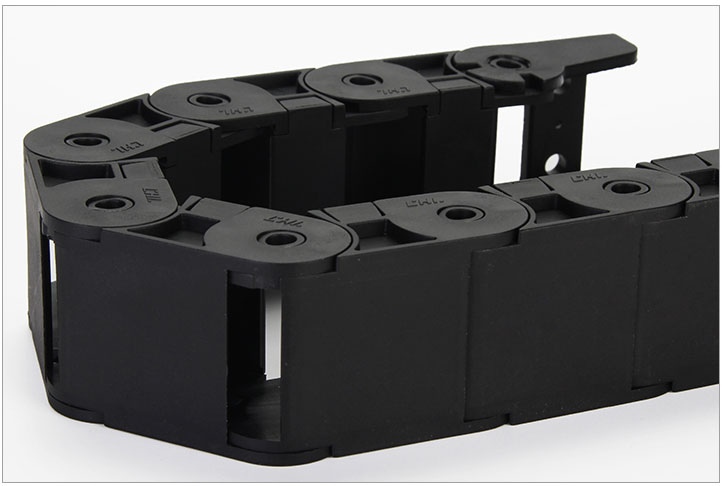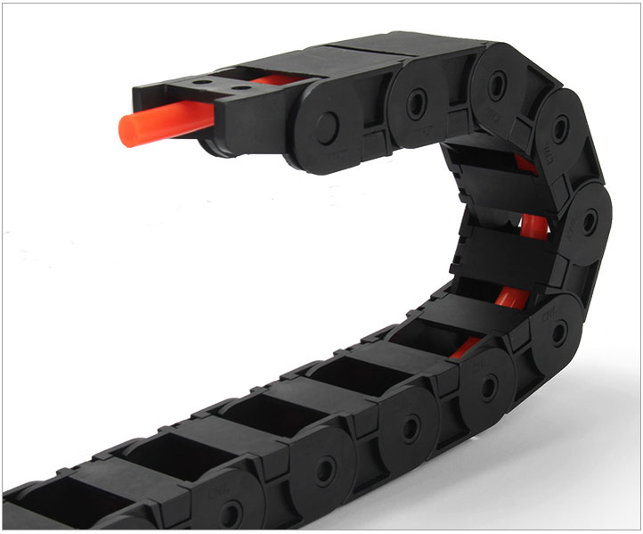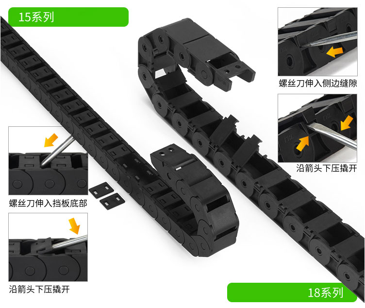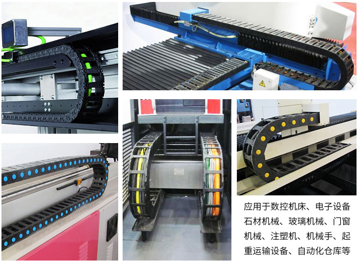 拖鏈每節都能打開,裝拆維修方便,不必穿線,打開蓋板后即可把電纜、油管、氣管、水管等放入拖鏈;